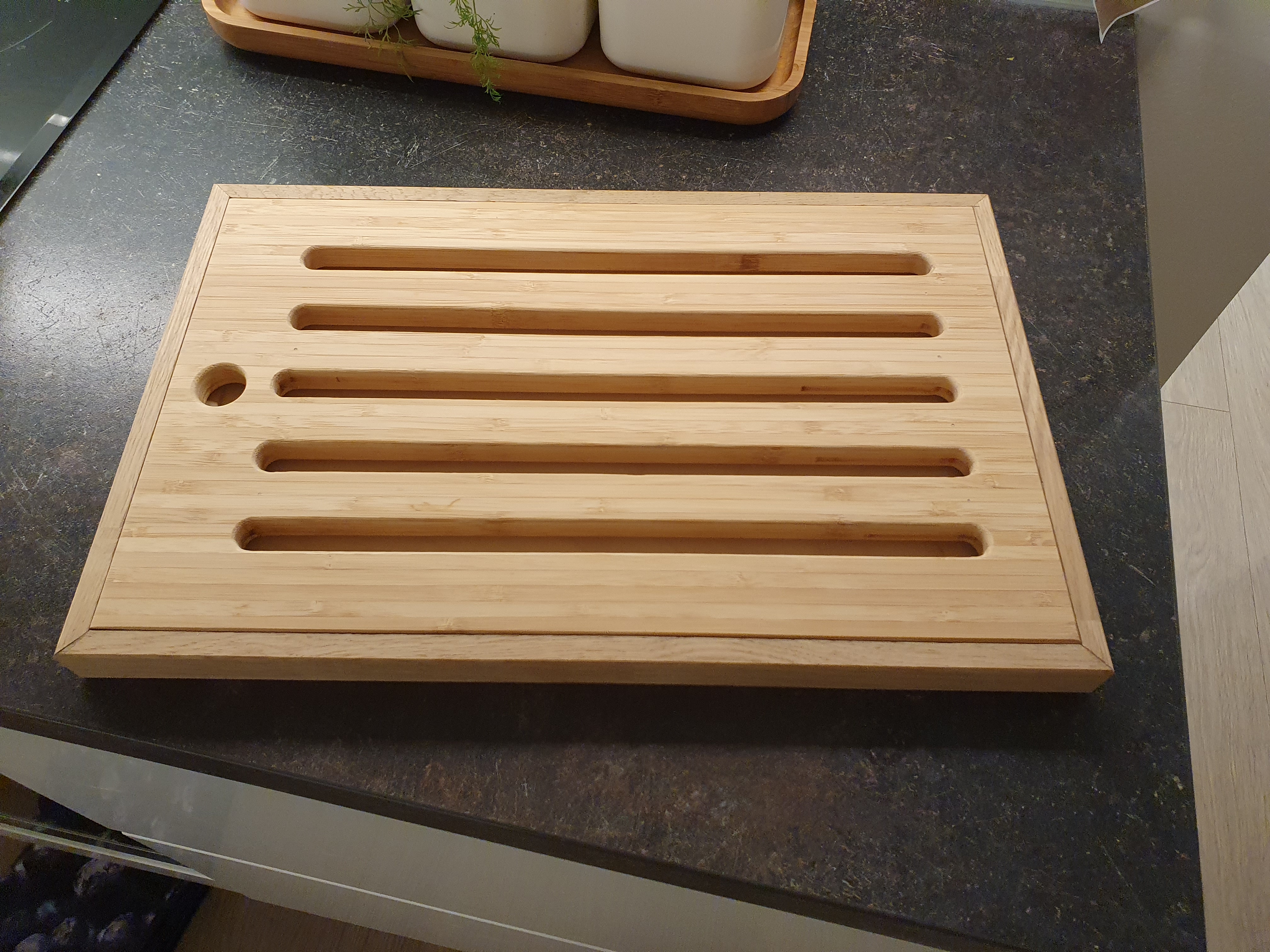 Leipäleikkuulauta murukaukalolla mittatilauksena.
